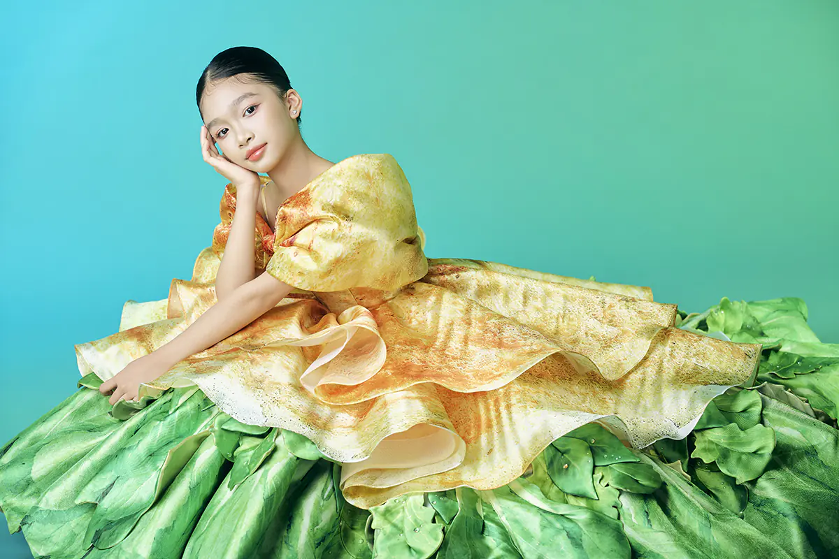 Thiết kế bánh xèo gây ấn tượng mạnh bởi bảng màu vàng nghệ, vàng nâu hòa quyện cùng sắc xanh lá. NTK xử lý bề mặt váy như những mảng màu loang tự nhiên, gợi liên tưởng đến lớp bánh xèo vừa đổ khuôn, còn nóng hổi. Phần vai trễ kết hợp chi tiết nơ lớn bản rộng tạo điểm nhấn mềm mại, trong khi chân váy bung nở nhiều lớp xanh lá phía dưới như hình ảnh chiếc bánh đặt trên nền lá – một chi tiết quen thuộc trong ẩm thực Nam Bộ. Tổng thể trang phục vừa gần gũi vừa mang tính trình diễn cao nhưng vẫn giữ được sự nhẹ nhàng cần thiết cho mẫu nhí.